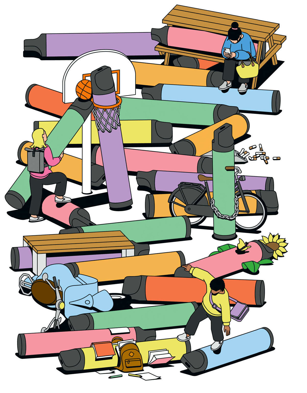 À l’heure de la récréation, devant le lycée Jeanne-d’Arc-Saint-Ivy de Pontivy, dans le Morbihan, une berline noire se gare. Moteur allumé, vitres opaques. Léa et Marion, 16 ans, doudoune noire et écharpe multicolore sur les épaules, s’approchent. Une vitre se baisse, un billet passe de main en main, et les deux adolescentes repartent avec des cigarettes électroniques minuscules, ou “puff”, aux allures de surligneurs fluo. Goûts “peach ice” et “lady killa”. Dans cette petite ville de 15 000 habitants, comme dans tant d’autres à travers la France, les cigarettes traditionnelles se font rares au coin fumeur du lycée. Très rares. “L’odeur est insupportable, ça reste collé aux vêtements, peste Léo, élève de terminale. La puff, au moins, ça sent bon.” Au pied de l’établissement, une bonne partie des élèves cachent une cigarette électronique miniature au fond d’une poche, d’une trousse ou d’un sac à main. Léa et Marion se sont mises à fumer ensemble, dans les toilettes du lycée ; Matthieu, leur camarade, a, lui, commencé en soirée. “Enfin plutôt à vapoter, sourit-il. C’est beaucoup moins cher qu’un paquet de cigarettes et on n’a pas à se soucier du briquet. On prend une bouffée, on la range, et ça fait beaucoup plus tourner la tête qu’une cigarette électronique classique.”
